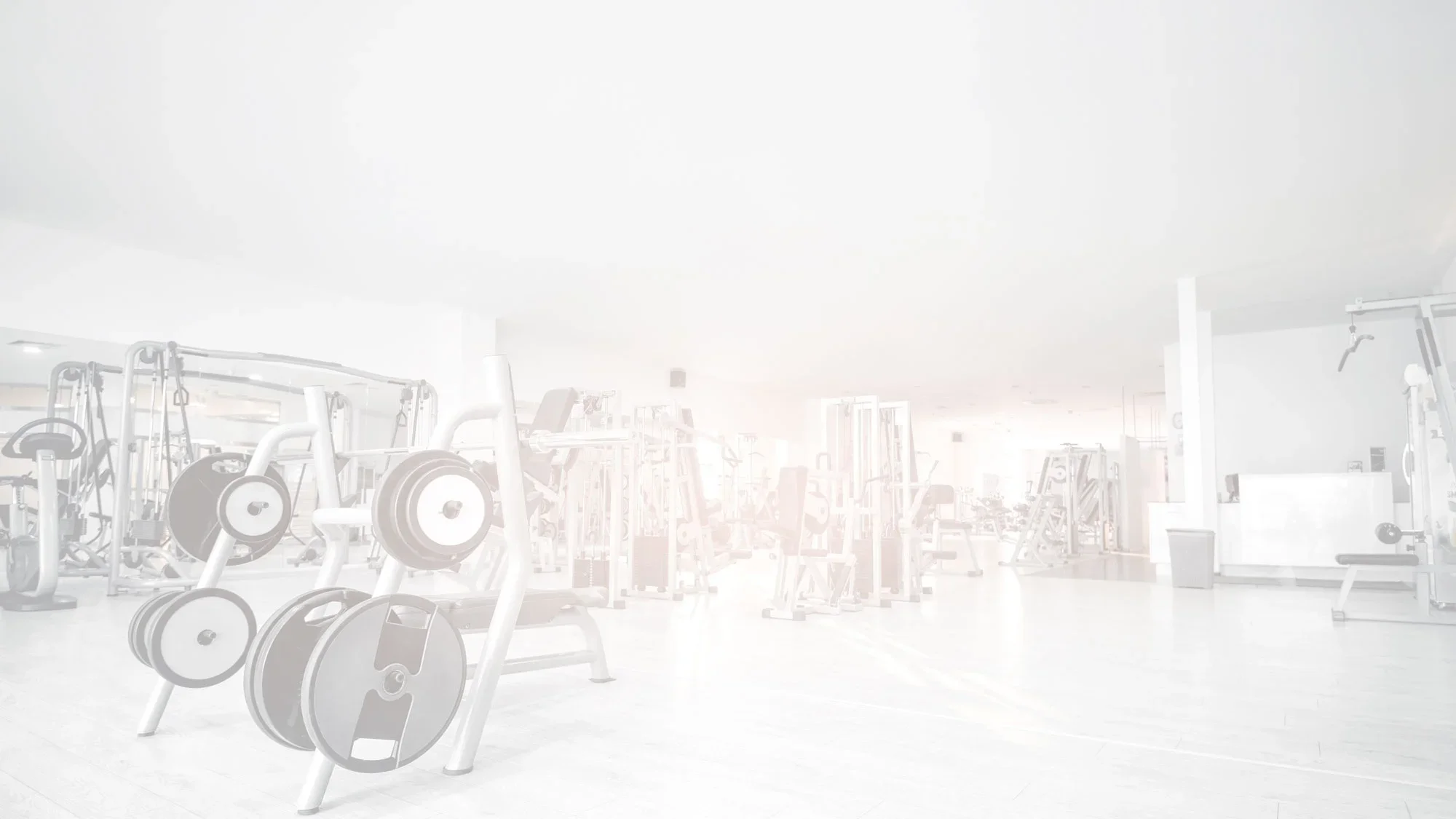 Empty gym with various workout equipment including weight machines and free weights, illuminated by bright lighting.